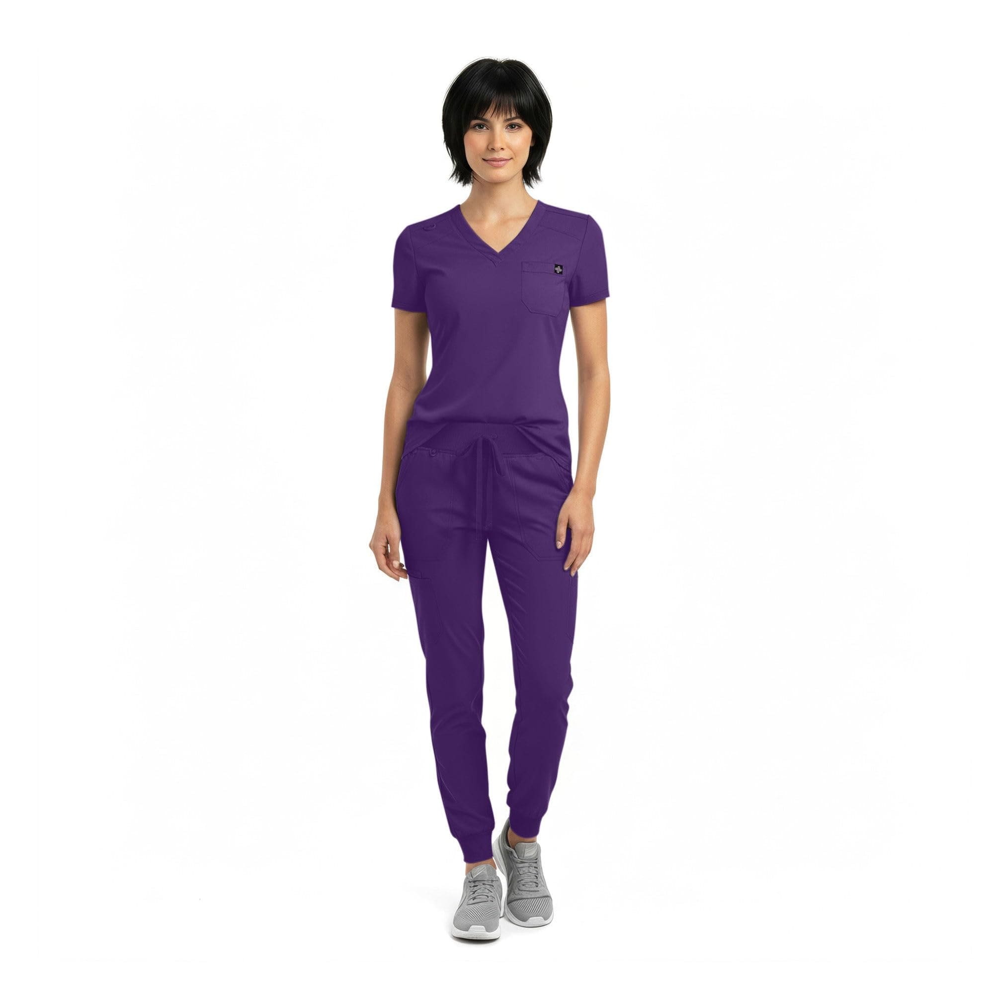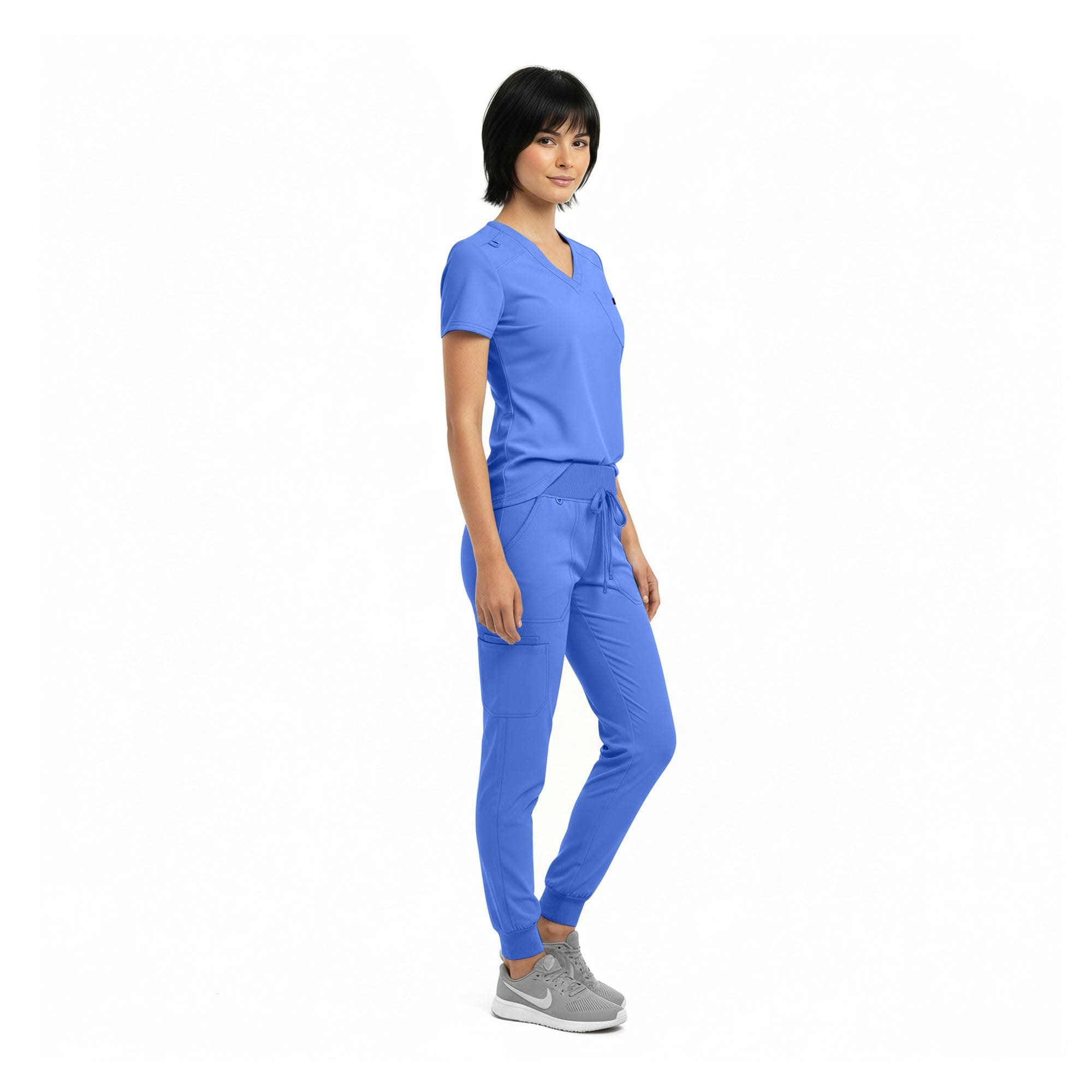 Upgrade your workwear with this ultra-soft women’s scrub set made from 93% polyester and 7% spandex for breathable comfort and flexible 2-way stretch. The V-neck top with rib-knit shoulder panels allows easy movement while maintaining a professional look. Designed with 8 functional pockets to keep essentials organized throughout the day. The modern jogger pants feature a rib-knit waistband and tapered cuffs for a secure and flattering fit. Lightweight, durable, fade-resistant fabric stays soft wash after wash and is machine washable for easy care.